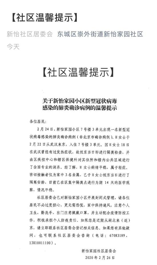 2月26日,北京东城区崇外街道新怡家园社区居委会发布一例新冠肺炎确诊病例信息引发舆论关注,该病例(黄女士亦称H女士)在武汉当地已有发热症状,2月22日由家属开车接回北京,现本人及其3名家属均被隔离。