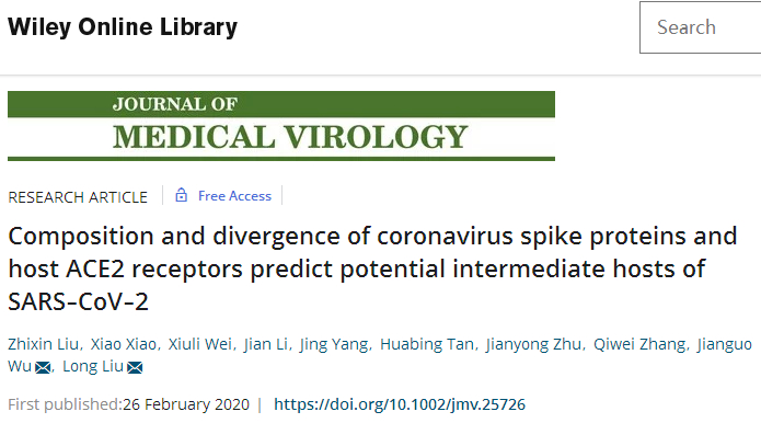 2月26日,湖北医药学院附属人民医院的刘龙联合广州暨南大学吴建国课题组在《医学病毒学杂志》上发表论文称,