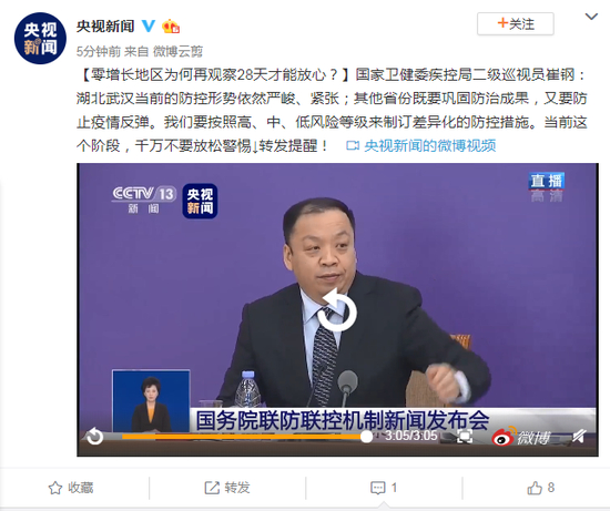 国家卫健委疾控局二级巡视员崔钢:湖北武汉当前的防控形势依然严峻、紧张;其他省份既要巩固防治成果,又要防止疫情反弹。我们要按照高、中、低风险等级来制订差异化的防控措施。当前这个阶段,千万不要放松警惕。