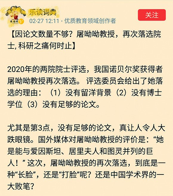 网络传闻近日称,“2020年两院院士评选,屠呦呦教授再次落选”,原因是“没有留洋背景,没有博士学位,没有足够的论文”。