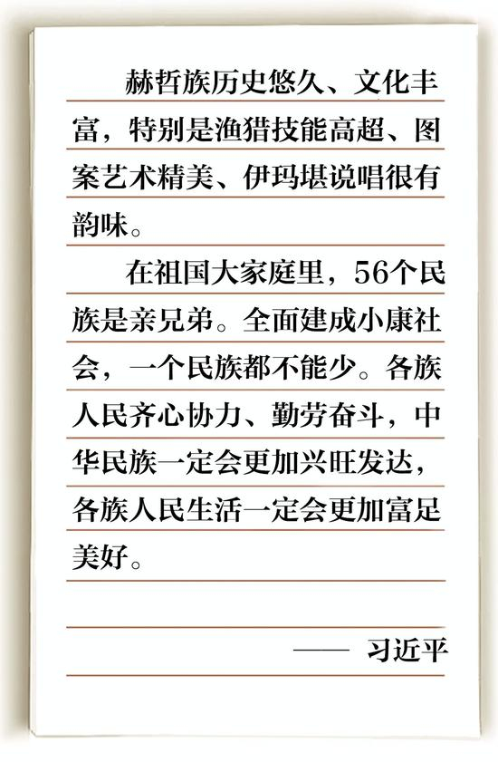 “总书记赞扬赫哲族历史悠久、文化丰富。我婆婆从前就老念叨,日子好过了,赫哲人的好传统不能丢。总书记这一点赞,她就更忙活了。”