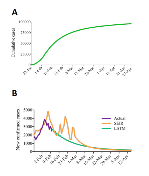 LSTM模型是一种递归神经网络(RNN),本研究基于2003年SARS流行病学数据,纳入COVID-19流行病学参数例如传染概率、传染系数(率)、潜伏率和退出率等进行模型训练。根据 LSTM模型预测,新增病例在2月4日达到高峰,到4月底预估有9.5万例确诊病例(图3A)。随后,我们对来自SEIR、LSTM以及中国每日新增病例数报告的数据绘制曲线。在1月22日至2月10日之间,新确诊病例实际数量与LSTM预测数据的曲线之间显著拟合(图3B)。SEIR和LSTM模型均预测在2月4日到7日之间会出现每日新增病例高峰,达到4000例。SEIR模型还预测2月中下旬的每日新增病例可能有几个新的小感染高峰出现,这可能是返程人口流动及复工导致的。