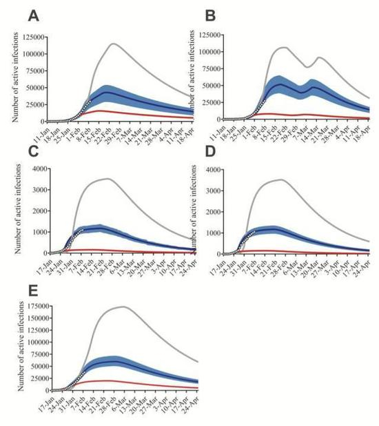 图2。 改进的SEIR模型预测曲线 (A)湖北省有严格管控,(B)湖北省减少管控力度,(C) 广东省,(D) 浙江省和(E)中国在1月23日(蓝色),5天后(灰色)和5天前(红色)采取干预措施时的流行曲线,把每天现存确诊病例的实际数据被拟合到曲线 (圆圈)上