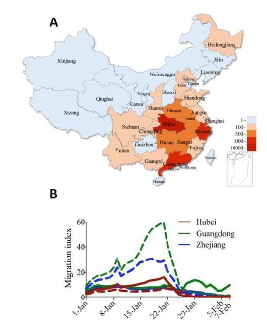 图1。 模型数据 (A)截止2月10日各省确认的COVID-19病例,数据来自https://voice.baidu.com/act/newpneumonia/newpneumonia/?from=osari_pc_3。 (B)2020年春节假期湖北、广东、浙江三省迁移率指数(实线-流入,虚线-流出)