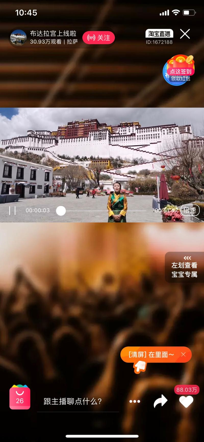 昨天下午,布达拉宫进行了1388年历史上首次直播,51分钟时间里有92万网友通过淘宝直播“云”游布达拉宫的建筑和馆藏,收获点赞逾88万。