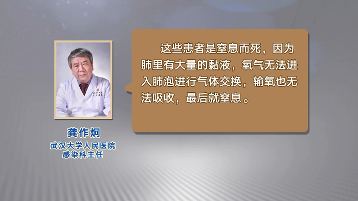 论文通讯作者、武汉大学人民医院感染科主任龚作炯表示,这些患者是窒息而死,因为肺里有大量的黏液,氧气无法进入肺泡进行气体交换,输氧也无法吸收,最后就窒息。需要更早、更主动地干预,才能降低病死率。