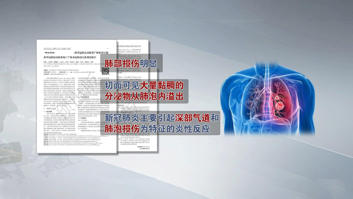 类似的结论,还出现在华中科技大学同济医学院法医系教授刘良与其团队的解剖报告里面,他们在对一例新冠肺炎逝者遗体解剖发现,死者肺部损伤明显,肺肉眼观呈斑片状,可见灰白色病灶及暗红色出血,切面可见大量黏稠的分泌物从肺泡内溢出,提示新冠病毒主要引起深部气道和肺泡损伤为特征的炎性反应。