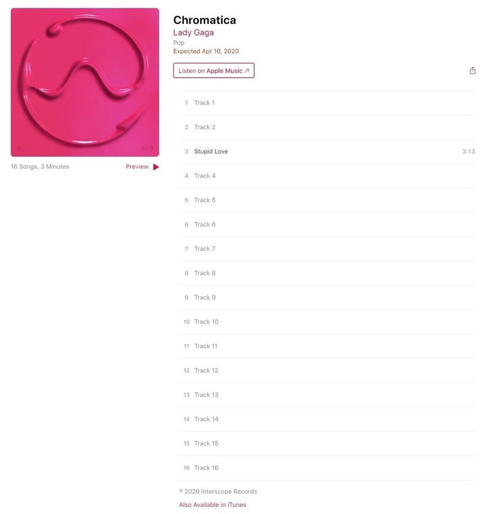 此前,已有外国媒体爆料,Lady Gaga的第六张录音室专辑疑似定名为《Chromatica》,并猜测将由12首作品组成,而最新开启的专辑预售页面上显示,新专辑 《Chromatica》收录了16首歌曲。