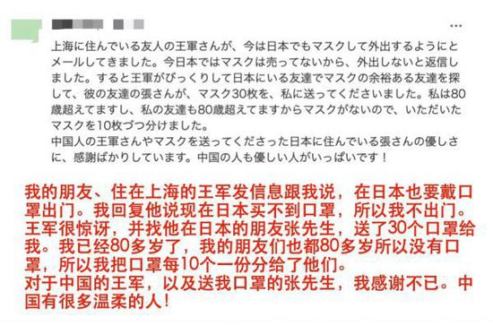 一位匿名日本网友就动情地写道:当得知自己没有口罩时,自己在上海的朋友特意托日本认识的人送了自己30只。