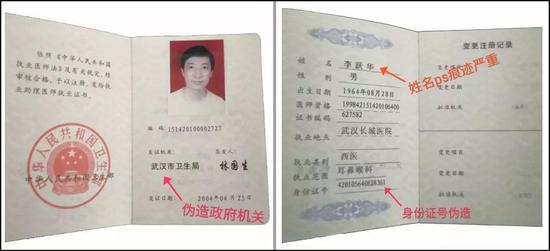调查中,李跃华出示了由武汉市卫生局2004年4月25日签发的《医师执业证书》,其内记载持证人为李跃华,执业地点武汉长城医院,执业类别西医,执业范围耳鼻喉科。经查,医师资格证书编码不符合目前国家编码规则。且医师资格证书上李跃华的身份证号码也与他的真实身份证号码不符。