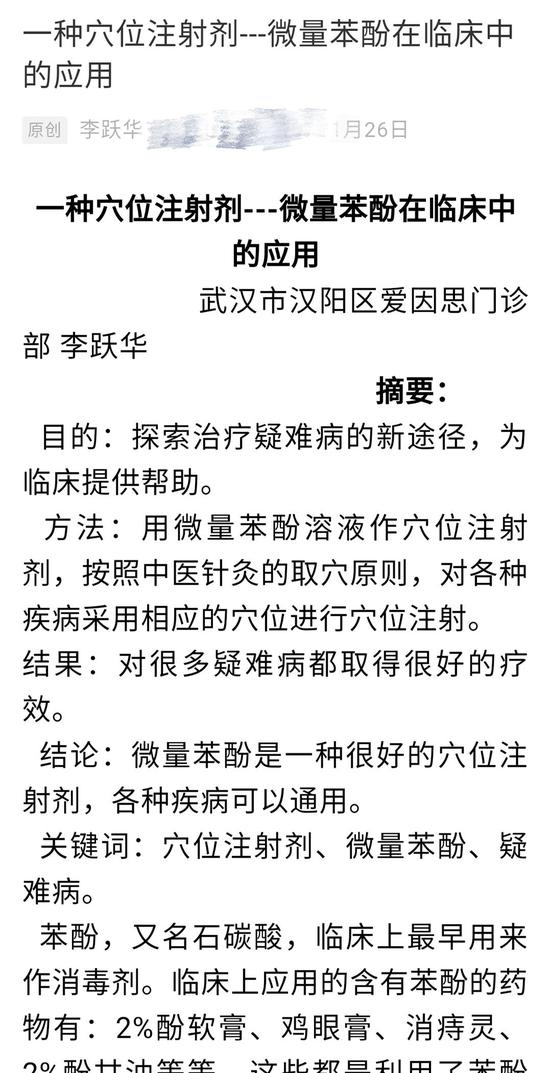▲李跃华发文称用微量苯酚穴位注射可以治多种疾病