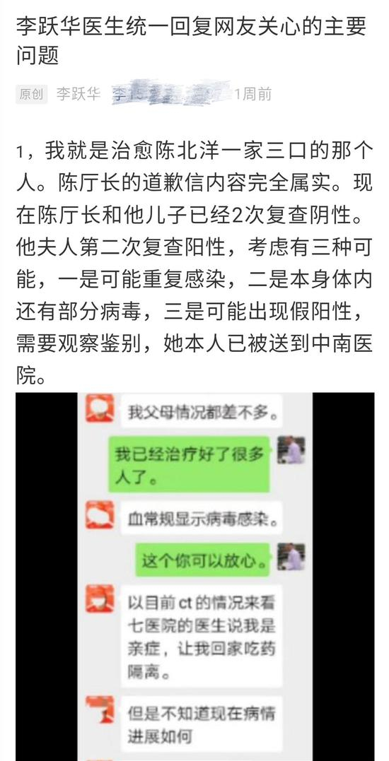 但李跃华却因这封《致歉信》进入大众视线。之后,他在个人微信公众号发文称,他就是治愈陈北洋一家三口的那个人。李跃华在微信朋友圈上发布了他与陈北洋儿子微信沟通治病全过程的聊天截图。