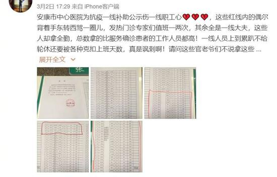 3月2日,有博主在微博上爆料称“安康市中心医院为抗疫一线补助公示伤一线职工心”、“安康市中心医院领导拿的补助比援鄂一线的都惊人”。