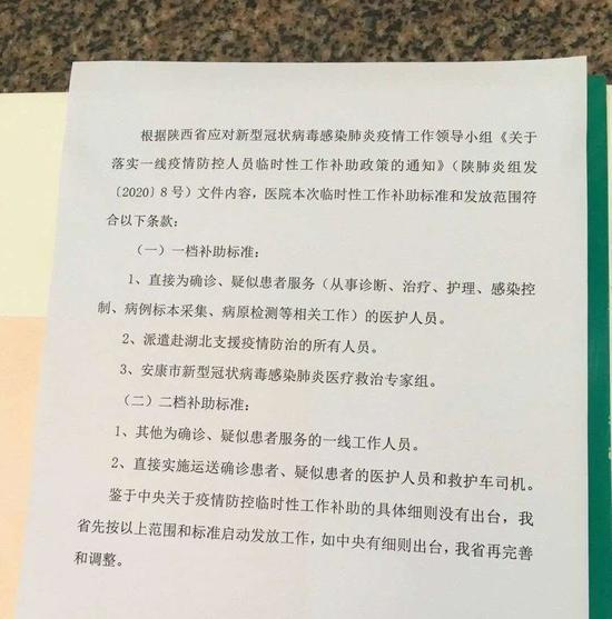 时代周报新媒体记者注意到,爆料人所发图片显示,该医院根据陕西省《关于落实一线疫情防控人员临时性工作补助政策的通知》相关文件内容,医院此次临时性工作补助标准和发放范围分为两个档次。