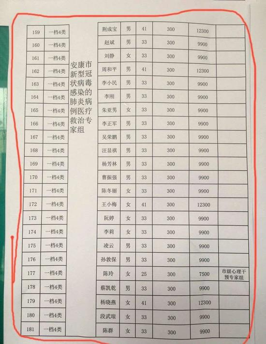 陕西省安康市中心医院院长陈文乾,副院长董根文、许真,均在网友披露的名单之中,补助41天,每天300元,即一共12300元。