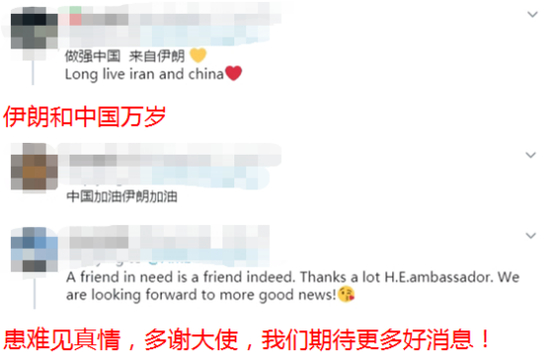 谈到中国援助时,伊朗驻华大使馆表示,“这份患难与共的情谊,是我们共同战“疫”的精神支撑,也是推动伊中关系向前发展的巨大动力”。
