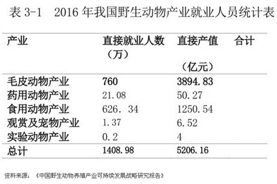 根据调查估算,2016年,全国野生动物养殖产业的专兼职从业者有1409多万人,创造产值5206多亿元人民币。其中,毛皮动物产业从业者约760万人,毛皮产业产值估算3894.83亿元;药用动物产业的从业者约21.08万人,创造产值50.27亿元;食用动物产业的从业者约626.34万人,创造产值1250.54亿元;观赏、宠物类产业的从业者约1.37万人,创造产值6.52亿元;实验灵长类动物产业直接从业者约2000人,创造产值4亿元。