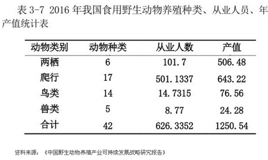 据估算,2016年我国食用动物产业的直接从业者约626.34万人,总产值1250.54亿元。其中两栖爬行类养殖从业人员101.7万人,年产值506.48亿元。爬行动物养殖从业人员501.13万人,年产值643.22亿元。鸟类养殖从业人员14.73万人,年产值76.56亿元。兽类养殖从业人员8.77万人,年产值24.28亿元。