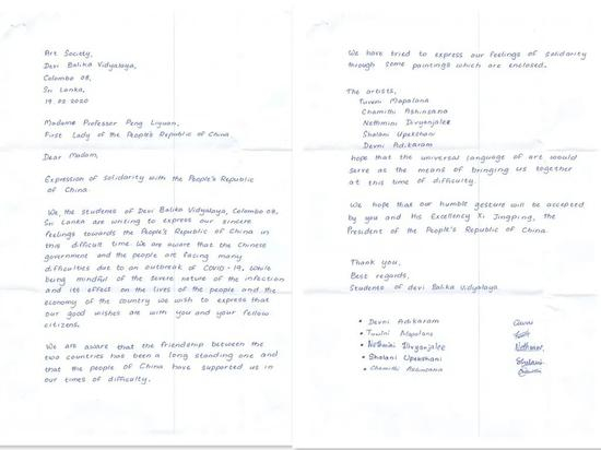 “敬爱的夫人:我们是斯里兰卡科伦坡八区德薇女子学校的学生……我们想通过随信附上的画作表达我们与中国团结在一起的心情……希望共通的艺术语言可以在困难时刻把我们连在一起。”