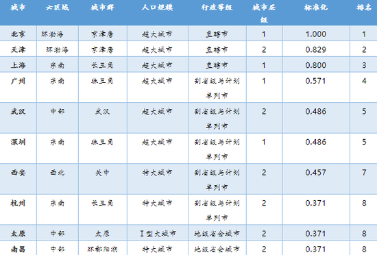 在三甲医院数指标排名中,前十位城市分别是北京、天津、上海、广州、武汉、深圳、西安、杭州、太原和南昌,东部地区仍然居多,在人口规模方面超大城市占主体,行政等级方面直辖市与省会城市依然优势突出,且前十城市均是一、二线城市。