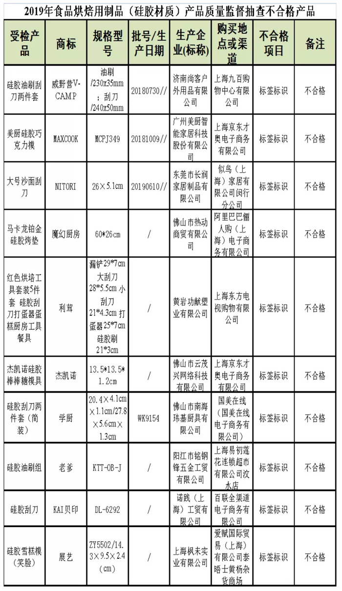 此外,10批次不合格食品烘焙用制品(硅胶材质)中,7批次的不合格产品“未标注生产日期”,2批次的不合格产品“标注作废标准”,1批次的产品“无中文标签”。不合格产品包括硅胶油刷刮刀两件套、美厨硅胶巧克力模、马卡龙铂金硅胶烤垫等。其中,威野营V-CAMP、MAXCOOK、NITORI等品牌上榜。