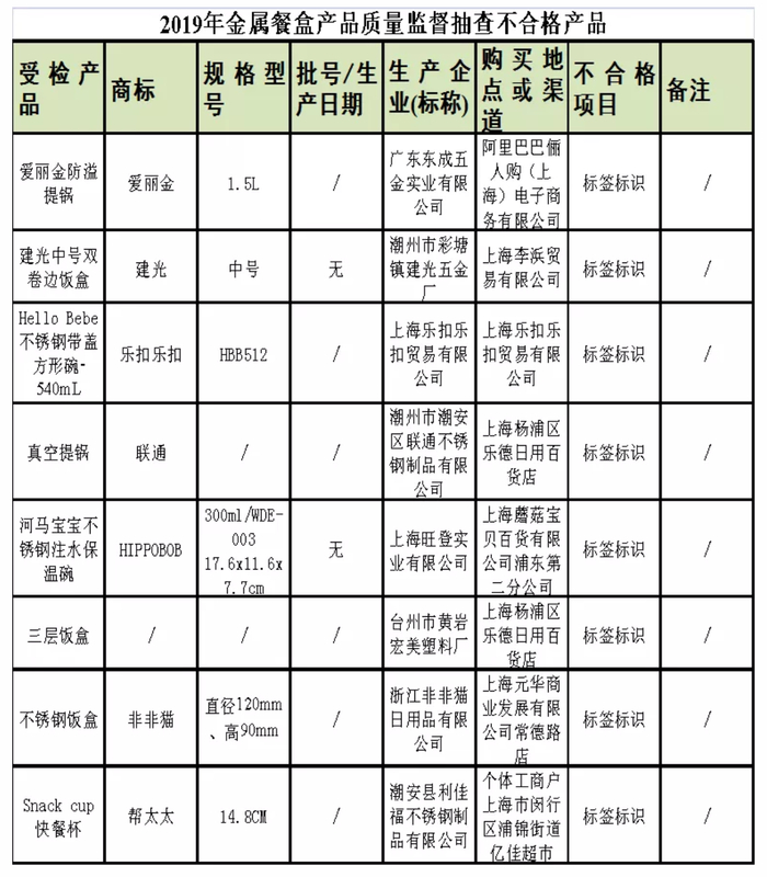 据上海市监管局介绍,18批次产品涉及不合格项目为标签标识。其中,8批不合格金属餐盒中,都存在“未标注生产日期”的情况,5批次的不合格产品“标注作废标准”,4批次的不合格产品“未标注材料成分”。新京报记者查看不合格名单发现,不合格金属餐盒涉及的品牌有爱丽金、建光、乐扣乐扣等。