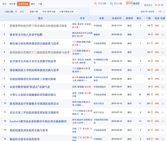 健康时报记者在知网检索发现,从2015年至2019年,彭义香在《中国医院》、《中国医院管理》、《中国高等医学教育》等期刊共发表文章14篇,主题多为医院管理、医学教育相关,未涉及临床内容。