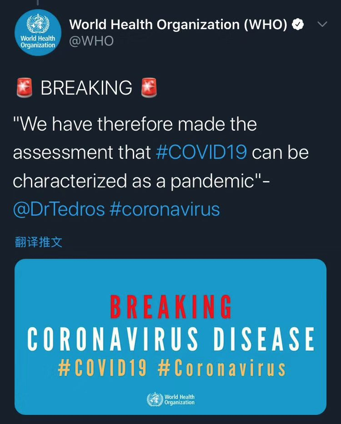 就在昨天,世界卫生组织(WHO)宣布新型冠状病毒病进入全球大流行(pandemic)状态,其基本定义就是疫情出现了全球或极广泛区域的传播。