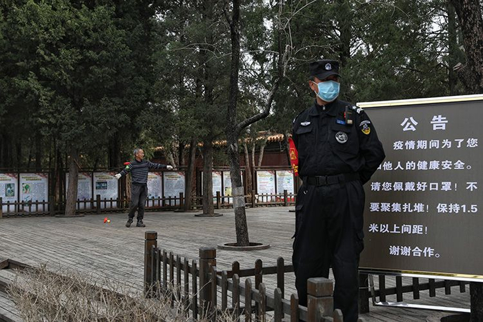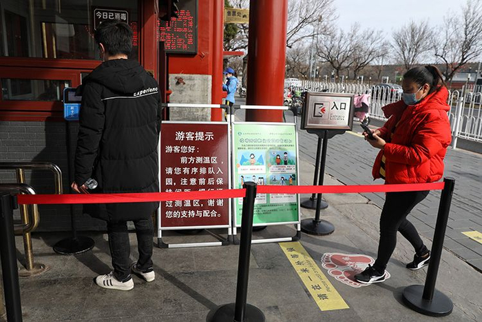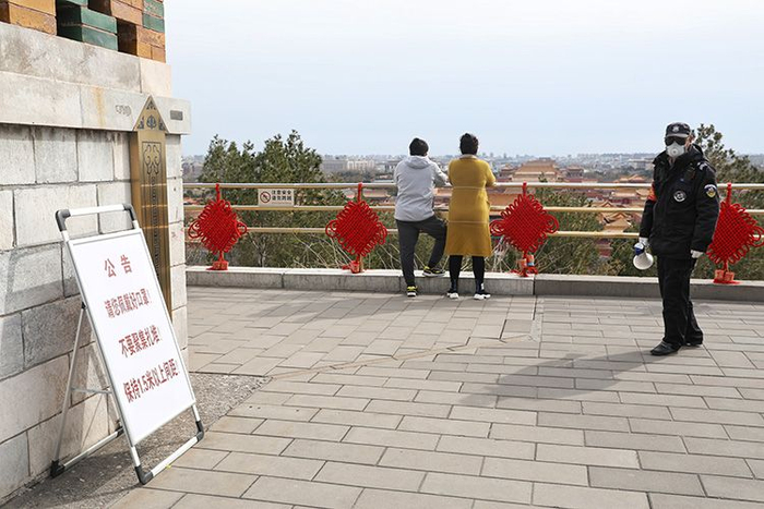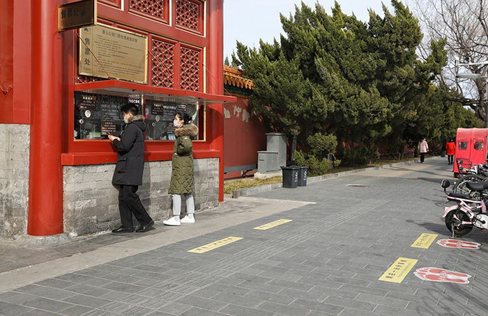 新京报讯 3月12日,新京报记者在景山公园看到,随着疫情防控的持续开展,公园近期新增了一批“不扎堆、不聚集”温馨提示牌,入口开设1米线,并优先推荐线上购票、扫码支付等非接触服务技术手段。目前,景山公园内寿皇殿景区、护国忠义庙景区、万春亭琉璃宇墙区域等室内展示及游客密集区域进行关闭,开放时间另行通知。