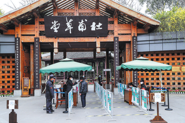 昨日,杜甫草堂博物馆恢复开放,观众在杜甫草堂北大门测量体温并登记身份信息后,进入参观。目前,园区计划每日接待游客不超过1200人。