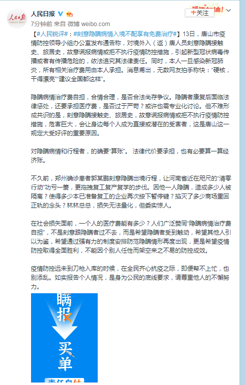 人民锐评:刻意隐瞒病情入境不配享有免费治疗