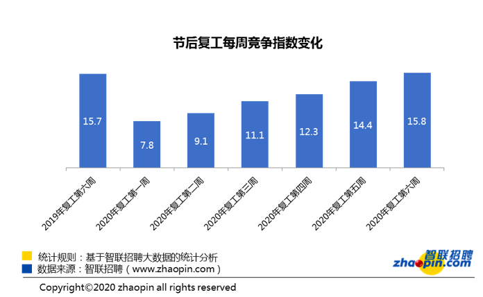 企业大面积复工拉动了就业市场的回暖。调查显示,复工第六周企业招聘职位数环比上涨6.48%,求职行为环比增速为18.63%,延续升温趋势。在求职端增速的不断推动下,就业竞争指数 较上一周提升至15.8,开始反超去年同期。