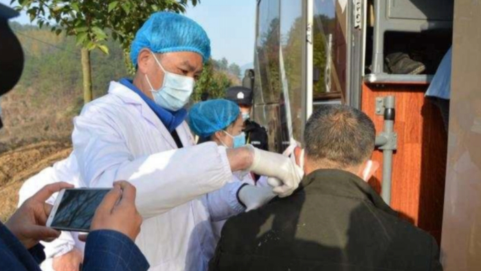 医护人员随行复工车队做体温测量。 来源:蕲春县委宣传部