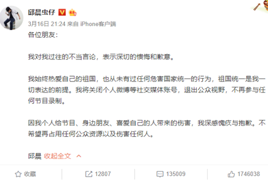 邱晨16日9时许作出回应,称对自己过往的不当言论,表示深切的懊悔和歉意。其表示始终热爱自己的祖国,也从未有过任何危害国家统一的行为,祖国统一是其一切表达的前提。其将关闭个人微博等社交媒体账号,退出公众视野,不再参与任何节目录制。↓