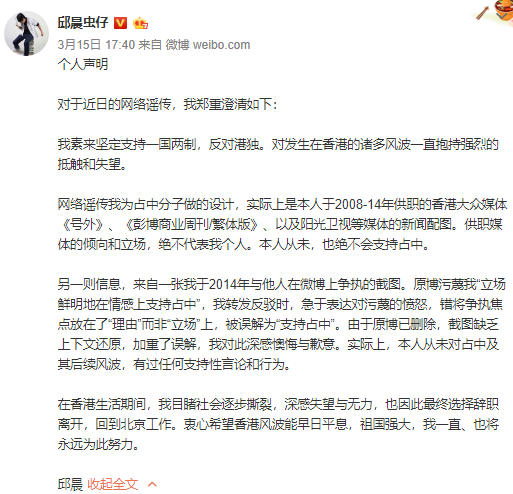 [环球网综合报道 记者 赵友平]辩论节目《奇葩说》第二季冠军邱晨被网友扒出在2014年多次发声支持非法“占中”,并创作相关宣传制品。3月16日晚,人民日报评论部官方微博对此发表微评“国家大义容不得巧舌如簧”,邱晨随后致歉,并宣布关闭个人社交账号,退出公众视野,不再参与任何节目录制。