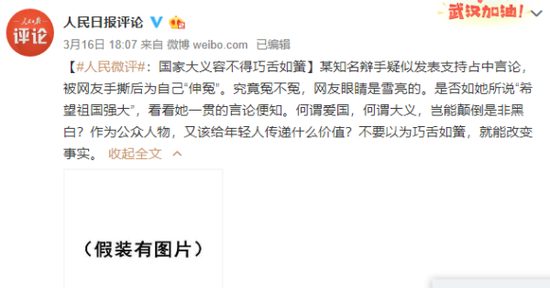16日下午,人民日报评论部官方博博@人民日报评论对此发声,向邱晨隔空喊话:国家大义容不得巧舌如簧。↓