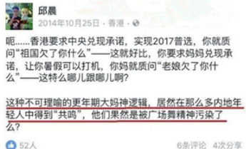 近日,有网友挖出《奇葩说》第二季冠军、米果文化联合创始人的邱晨在2014年曾发表过疑似支持非法“占中”言论,并参与创作相关文宣设计。↓