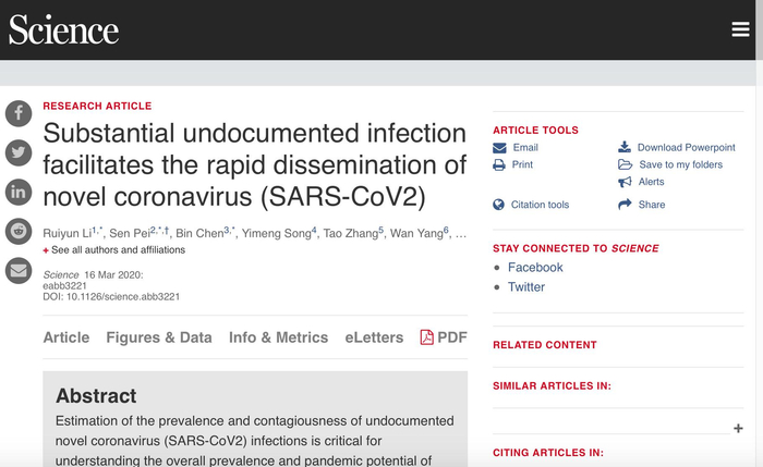 以上结论来自当地时间3月16日国际顶级学术期刊《科学》在线发表的论文 “Substantial undocumented infection facilitates the rapid dissemination of novel coronavirus (SARS-CoV2)”。研究者通过计算机模型发现,未记录的新冠病毒感染者是造成新冠疫情迅速蔓延的主要原因,也是疫情初期难以防控的核心。
