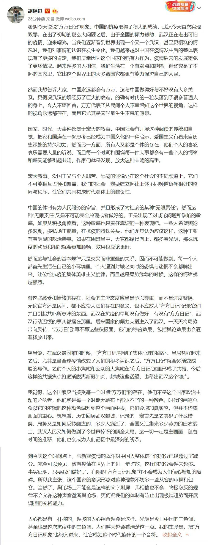 3月19日,《环球时报》总编辑胡锡进在谈论“方方日记”现象时表示,在武汉最困难的时候,“方方日记”戳到了集体心理的痛处,当局势好起来之后,尤其是当全球疫情改变了人们的很多认识之后,“方方日记”就会逐渐变成一般的写作。全文如下: