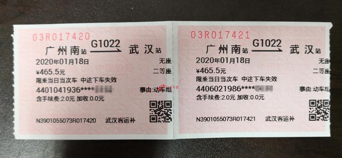这是一张动车票,出发时间为1月18日,起点和终点分别是广州南站、武汉站。二等座,票价465.5元。除此之外,它还传递着两个更重要的信息:无座、补票;身份证号显示1936,乘车人已经84岁高龄?