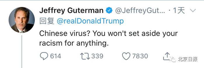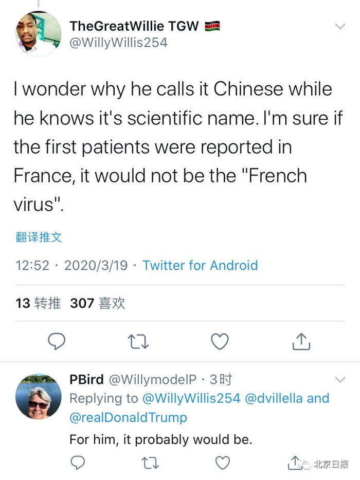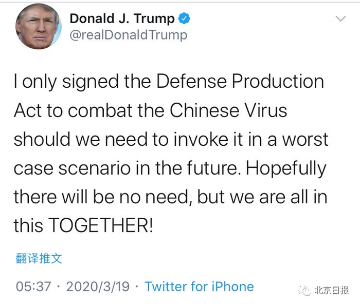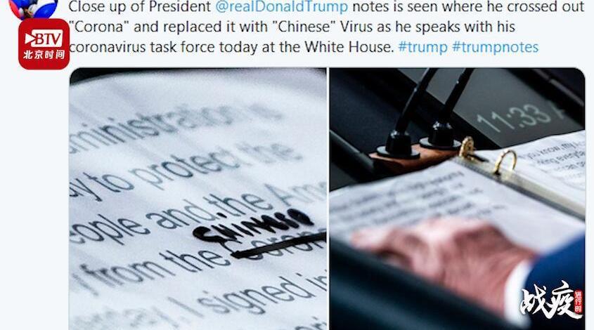 北京日报客户端记者注意到,近日,特朗普多次在社交平台及公共场合,公然用“Chinese Virus(中国病毒)”这一涉嫌种族主义歧视的词语替代“coronavirus(新冠病毒)”。
