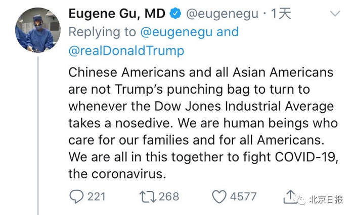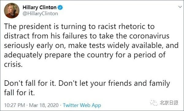 18日,特朗普昔日的老对手希拉里·克林顿站出来,戳破特朗普试图用这种“种族主义”的言论来掩盖其工作失职的行为。她表示:“总统正在滑向种族主义言论,想转移人们注意力,(掩盖)他未能及早认真对待新冠病毒、广泛提供检测、为美国应对危机做好充分准备。不要上当了,不要让你的朋友和家人上当。”
