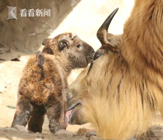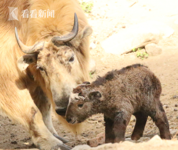 新出的羚牛幼崽全身深褐色,全身湿漉漉,额头有小撮白斑,十分可爱。10多分钟便站立起来,对周围一切感到好奇,半小时后开始在母体肚皮下寻奶吃,而母体不顾疲惫,不停舔舐幼仔。