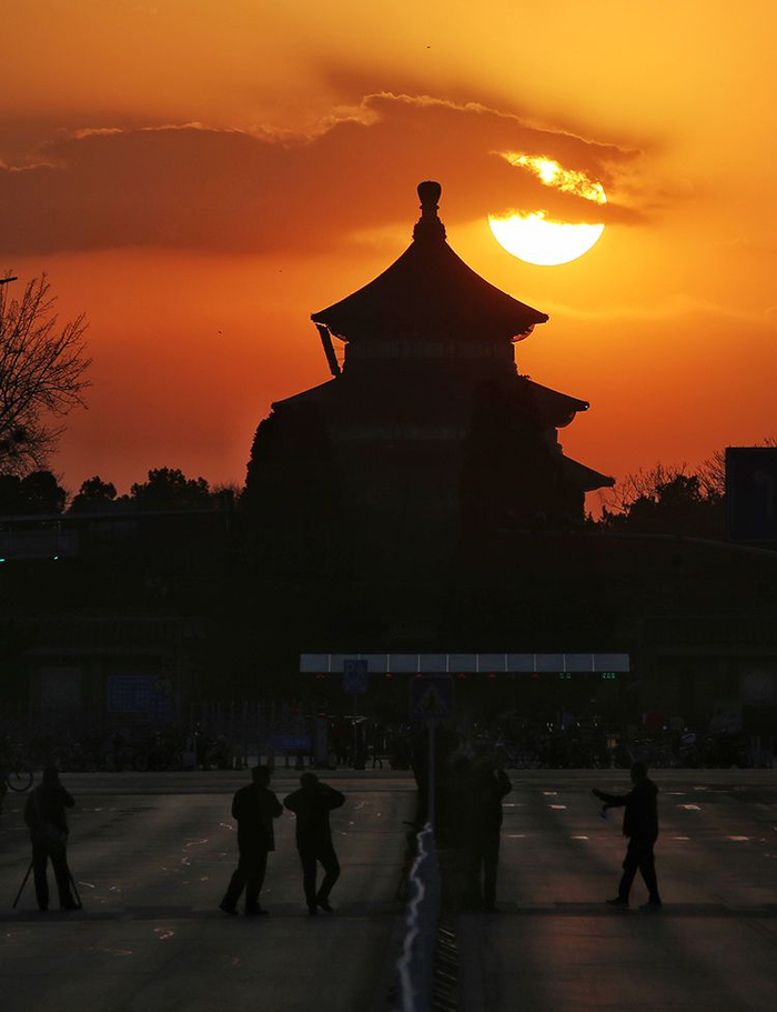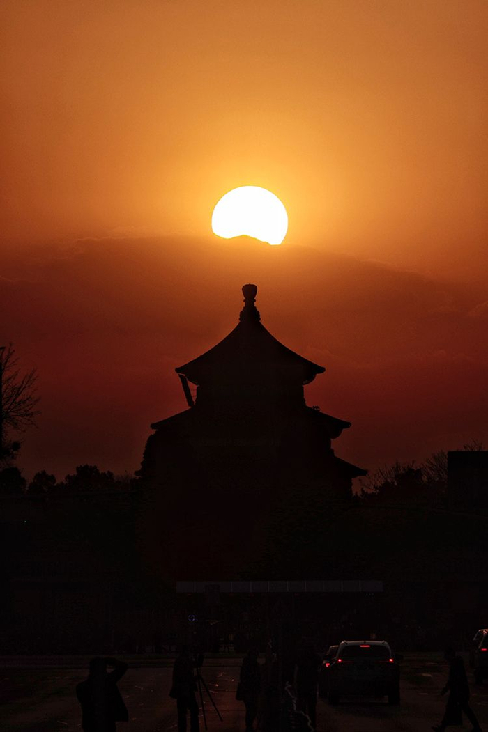 日落时分,天坛祈年殿“头”顶落日,景象奇特。