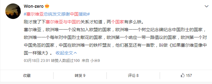随着海外疫情的发展,不少国家纷纷告急请求支援。在塞尔维亚总统武契奇发布求助视频后,微博网友留言督促塞尔维亚大使馆开通了微博。不得不感叹,这届网民爱的太硬核!