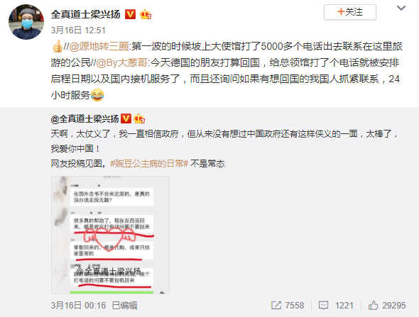 微博网友@By大葱哥称:自己的德国朋友打算回国,给总领馆打了个电话就被安排启程日期以及国内接机服务了,而且还询问如果有想回国的中国人抓紧联系,提供24小时服务。@全真道士梁兴扬感叹道:“天啊,太仗义了,我一直相信政府,但从来没有想过中国政府还有这样侠义的一面,太棒了,我爱你中国!”@功遂身退之留言称:“感动,只有祖国繁荣昌盛才有能力为你们遮风挡雨。”