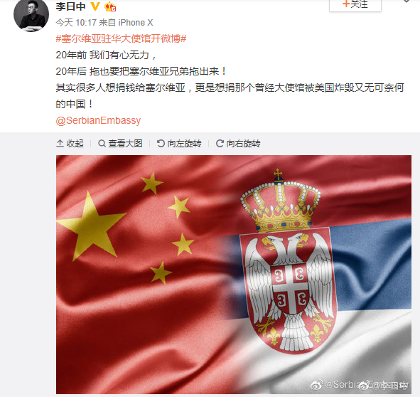 微博网友@李日中:“20年前,我们有心无力,20年后,拖也要把塞尔维亚兄弟拖出来”