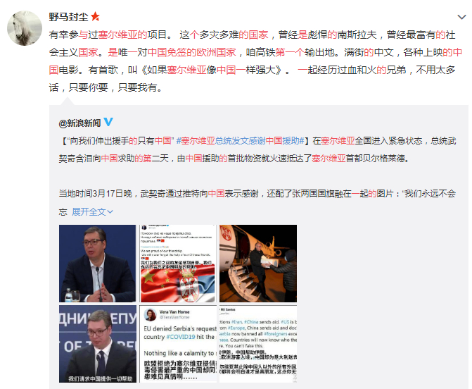 @野马封尘:“曾经是彪悍的南斯拉夫,是唯一对中国免签的欧洲国家,咱高铁第一个输出地。满街的中文,各种上映的中国电影。有首歌,叫《如果塞尔维亚像中国一样强大》,一起经历过血和火的兄弟,不用太多话,只要你要,只要我有。”