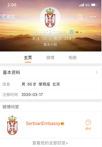 塞尔维亚向中国发出紧急求助后,中国派医疗专家组赴塞抗疫。塞尔维亚国家旅游局的致谢微博成了“两国的友谊互动地”微博下网友留言表示要为塞尔维亚捐款,还催促塞尔维亚大使馆赶紧开微博。