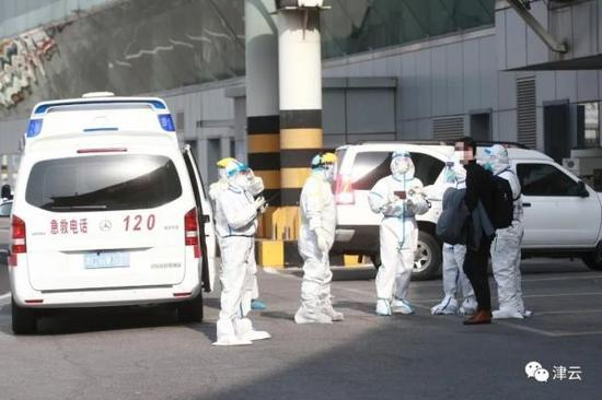 9:06,120急救车经过专用通道到达现场,将该名发热乘客转送天津市定点医院进行进一步医学排查。